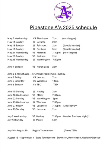 Join us at A's Field in Westview Park on 2nd Street NW, North of Paulsen Field on West MN Hwy 30. The Pipestone A's are a member of the Gopher League.